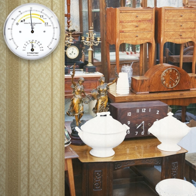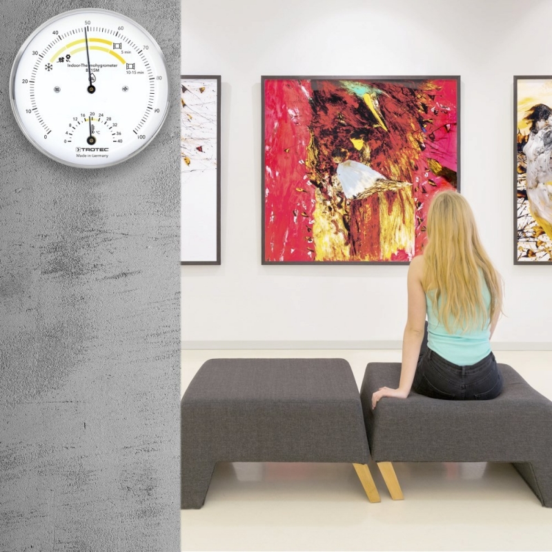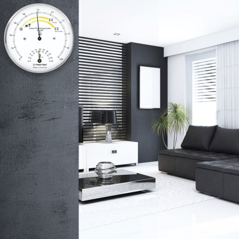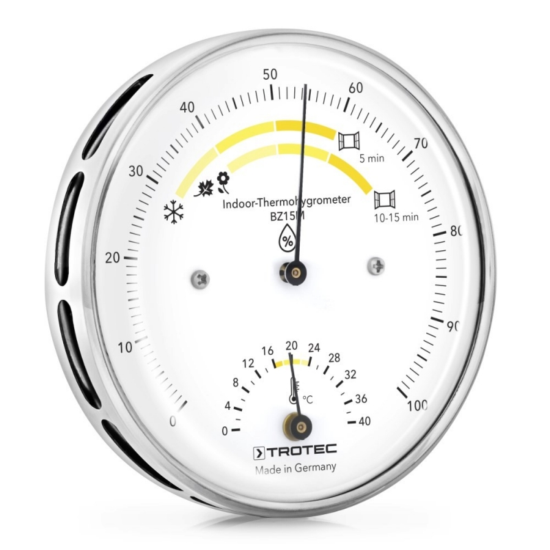 Termohigrometrul BZ15M este usor de citit, avand incorporat in design o scala colorata de la galben pal la galben inchis, ajutand astfel la citirea valorilor temperaturii si a umiditatii aerului. In plus, BZ15M detine si un indicator de aerisire in functie de anotimp, care folosit corespunzator, poate sa previna formarea mucegaiului in incaperi.