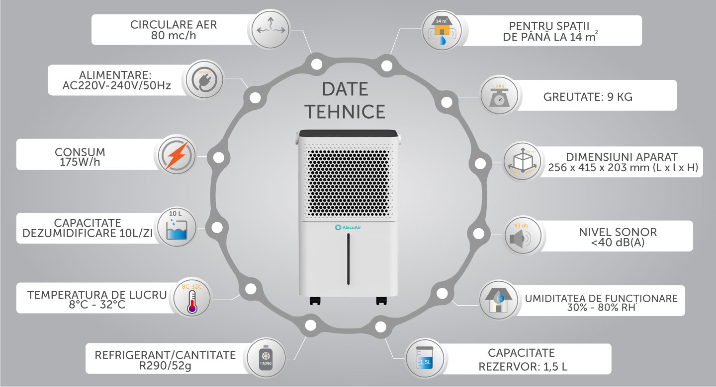 Dezumidificatorul AlecoAir D10 Junior imbina eficienta, functionalitatea si un design modern, usor de integrat in orice incapere din casa.